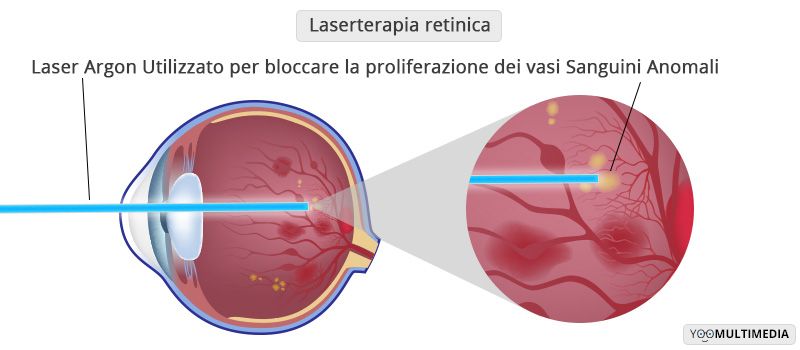 La laserterapia retinica con Argon Laser si utilizza per arrestare la proliferazione di nuovi vasi sanguigni dannosi o per cicatrizzare, tramite la fotocoagulazione, le rotture retiniche in modo da bloccarle e rinforzare la struttura della retina.